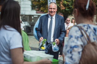 Gdańsk- Długi Targ. Apcja zachęcająca do picia wody z kranu, zorganizowana przez Saur Neptun Gdańsk. Nz. Prezes Saur Neptun Gdańsk, Guy Fournier