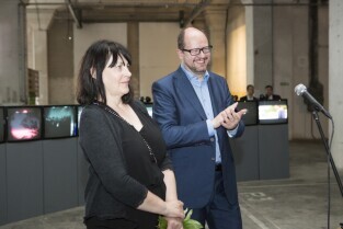 Festiwal sztuki nowoczesnej Alternativa 2015 - wystawa w Hali 90B Stoczni Gdańskiej. Nz. Dyrektor Artystyczny Festiwalu Aneta Szyłak i Prezydent Gdańska Paweł Adamowicz