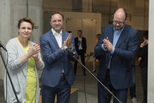 Festiwal sztuki nowoczesnej Alternativa 2015 - wystawa w Hali 90B Stoczni Gdańskiej. Nz. od lewej: Minister Kultury i Dziedzictwa Narodowego Małgorzata Omilanowska, Marszałek Woj. Pomorskiego Mieczysław Struk i Prezydent Gdańska Paweł Adamowicz