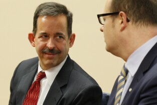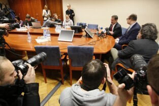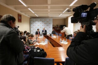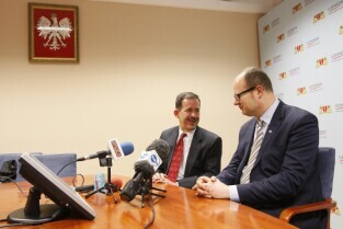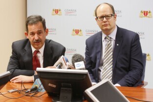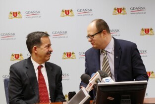 Konferencja prasowa Prezydenta Gdańska Pawła Adamowicza i Ambasadora USA w Polsce Stephena D. Mulla. Gdańsk, Urząd Miejski