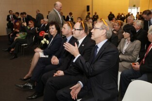 Gdańsk Letnica. Otwarcie centrum wystawienniczo-kongresowego AmberExpo, inwestycji zrealizowanej przez Międzynarodowe Targi Gdańskie SA. Nz. od lewej: Wicemarszałek Woj. Pomorskiego Hanna Zych-Cisoń, Członek Zarządu Woj. Pomorskiego Ryszard Świlski, Prezydent Gdańska Paweł Adamowicz, Wojewoda Pomorski Ryszard Stachurski