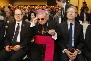 Gdańsk Letnica. Otwarcie centrum wystawienniczo-kongresowego AmberExpo, inwestycji zrealizowanej przez Międzynarodowe Targi Gdańskie SA. Nz. od lewej: Członek Zarządu Woj. Pomorskiego Ryszard Świlski, Prezydent Gdańska Paweł Adamowicz, Metropolita Gdański Abp Sławoj Leszek Głódź, Wojewoda Pomorski Ryszard Stachurski