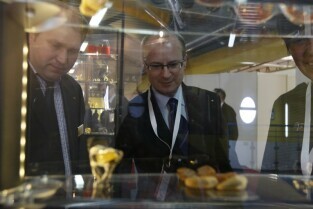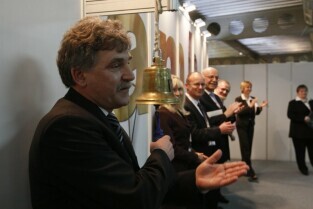 Amberif 2011. 18. Międzynarodowe Targi Bursztynu, Biżuterii i Kamieni Jubilerskich. Gdańsk, Międzynarodowe Targi Gdańskie. Nz. Wojewoda Pomorski Roman Zaborowski uderzeniem w dzwon oficjalnie otwiera targi