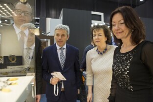 Amberif 2015 - 22. Międzynarodowe Targi Bursztynu, Biżuterii i Kamieni Jubilerskich. Nz. od lewej: Prezydent Gdańska Paweł Adamowicz, Radny Miasta Gdańska Andrzej Kowalczys, Wicemarszałek Woj. Pomorskiego Hanna Zych-Cisoń