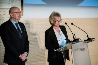 Amberif 2017. 24. Międzynarodowe Targi Bursztynu, Biżuterii i Kamieni Jubilerskich. Gdańsk, Amber Expo. Nz. Andrzej Kasprzak, prezes Międzynarodowych Targów Gdańskich i Ewa Rachoń