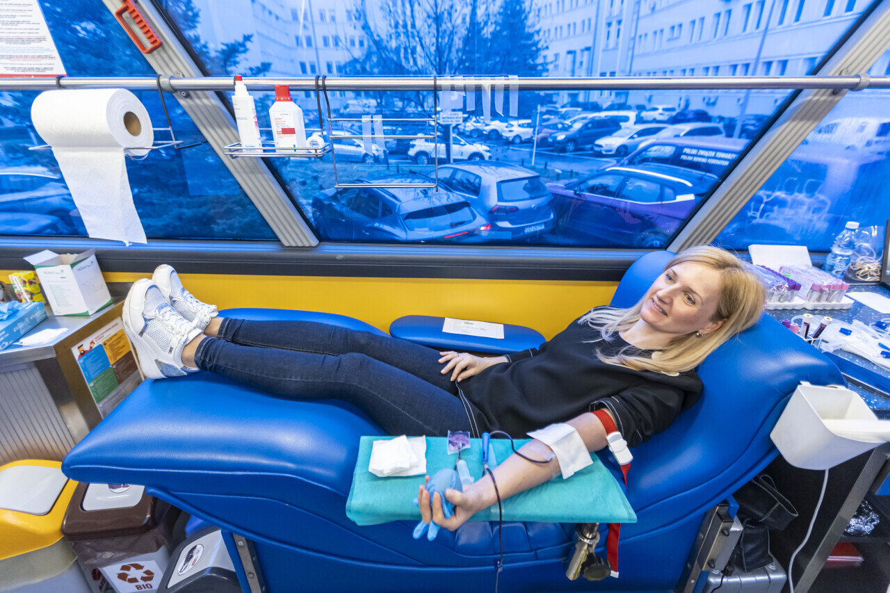 Gdańsk. Pracownicy Urzędu Miejskiego oraz mieszkańcy mogli oddać krew w specjalistycznym ambulansie do pobierania krwi, który stanął na dziedzińcu Urzędu Miejskiego w Gdańsku