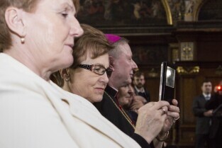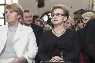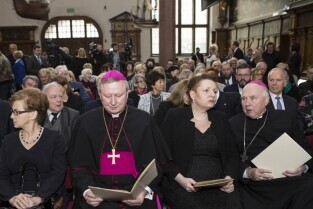 Gdańsk, Dwór Artusa. Uroczystość nadania tytułu Honorowego Obywatela Miasta Gdańska reżyserowi Andrzejowi Wajdzie podczas nadzwyczajnej Sesji Rady Miasta. Nz. od lewej: Danuta Wałęsa, Biskup pomocniczy Archidiecezji Gdańskiej Wiesław Szlachetka, Małgorzata Omilanowska, Abp Senior Tadeusz Gocłowski
