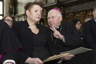 Gdańsk, Dwór Artusa. Uroczystość nadania tytułu Honorowego Obywatela Miasta Gdańska reżyserowi Andrzejowi Wajdzie podczas nadzwyczajnej Sesji Rady Miasta. Nz. Małgorzata Omilanowska i Abp Senior Tadeusz Gocłowski