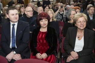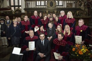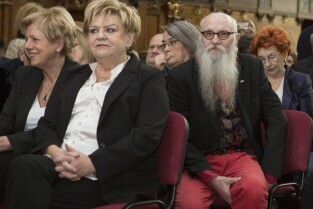 Gdańsk, Dwór Artusa. Uroczystość nadania tytułu Honorowego Obywatela Miasta Gdańska reżyserowi Andrzejowi Wajdzie podczas nadzwyczajnej Sesji Rady Miasta. Nz. od lewej: Z-ca Prezydenta Gdańska Piotr Grzelak, Dyrektor portalu gdansk.pl Helena Chmielowiec, Sekretarz Miasta Gdańska Danuta Janczarek
