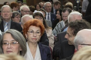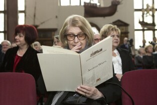 Gdańsk, Dwór Artusa. Uroczystość nadania tytułu Honorowego Obywatela Miasta Gdańska reżyserowi Andrzejowi Wajdzie podczas nadzwyczajnej Sesji Rady Miasta. Nz. Krystyna Zachwatowicz (żona Andrzeja Wajdy)