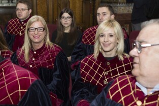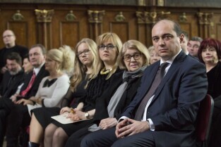 Gdańsk, Dwór Artusa. Uroczystość nadania tytułu Honorowego Obywatela Miasta Gdańska reżyserowi Andrzejowi Wajdzie podczas nadzwyczajnej Sesji Rady Miasta. Nz. Radni Miasta Gdańska: Agnieszka Owczarczak, Marek Bumblis, Mirosław Zdanowicz