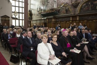 Gdańsk, Dwór Artusa. Uroczystość nadania tytułu Honorowego Obywatela Miasta Gdańska reżyserowi Andrzejowi Wajdzie podczas nadzwyczajnej Sesji Rady Miasta. Nz. od lewej: Małgorzata Omilanowska, Abp Senior Tadeusz Gocłowski, Marszałek Woj. Pomorskiego Mieczysław Struk