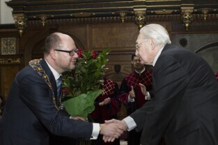 Gdańsk, Dwór Artusa. Uroczystość nadania tytułu Honorowego Obywatela Miasta Gdańska reżyserowi Andrzejowi Wajdzie podczas nadzwyczajnej Sesji Rady Miasta. Nz. Prezydent Gdańska Paweł Adamowicz