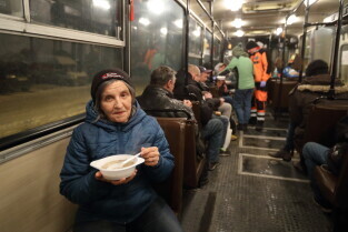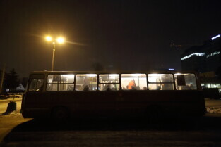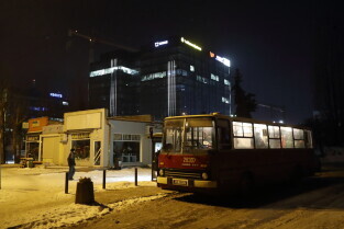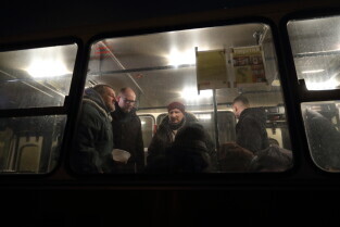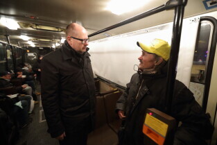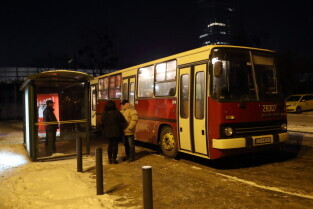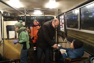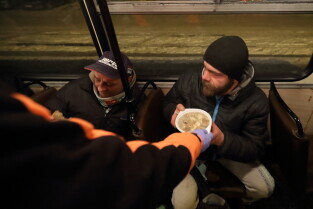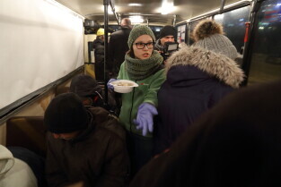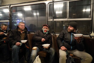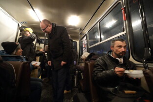 Gdańsk. Wizyta Prezydenta Gdańska Pawła Adamowicza w autobusie SOS, w którym osoby bezdomne mogą się ogrzać, zjeść ciepłą zupę, otrzymać pomoc medyczną i informacje o formach pomocy.