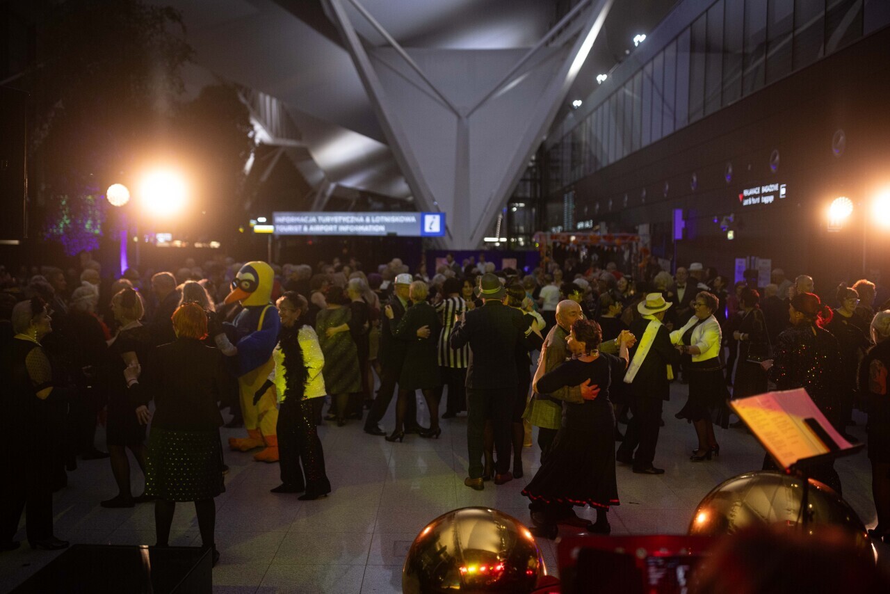 Gdańsk, Port Lotniczy Gdańsk im. Lecha Wałęsy. Karnawał dla seniorów na lotnisku. Udział wzięli min. Aleksandra Kosiorek, Agnieszka Baranowska oraz Piotr Grzelak.