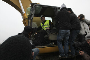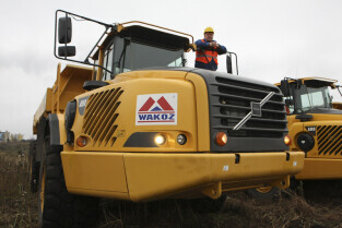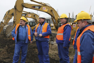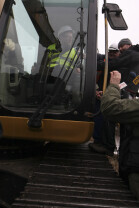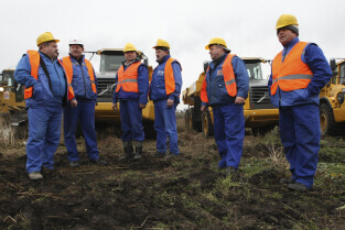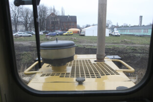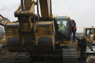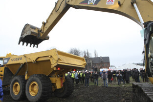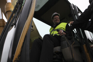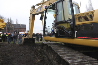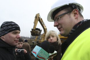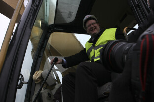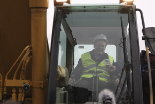 Rozpoczęcie prac ziemnych pod budowę stadionu. Gdańsk Letnica. Nz. w koparce Paweł Adamowicz, Prezydent Gdańska