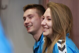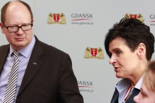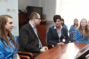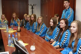Urząd Miejski w Gdańsku. Spotkanie prezydenta Gdańska Pawła Adamowicza z członkami zespołu Baltica Cheerleaders oraz z ich trenerem panią Alicją Płonką.