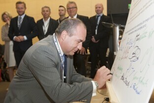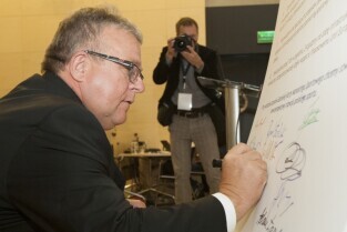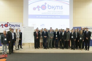 Bałtycki Kongres Marketingu Sportowego. Podpisanie Gdańskiej Karty Marketingu Sportowego. Wspólne zdjęcie osób podpisujących Kartę. Gdańsk Letnica, AmberExpo