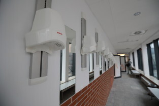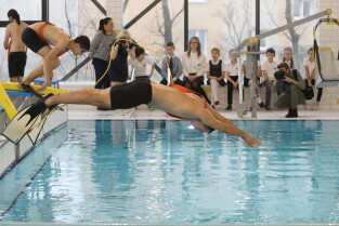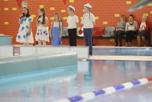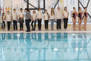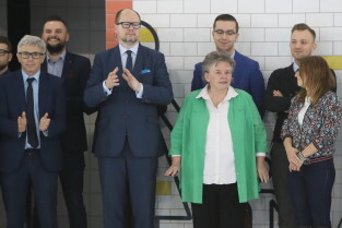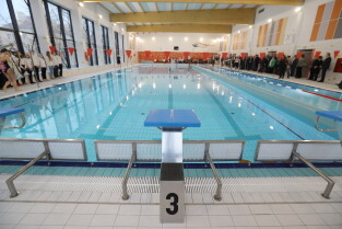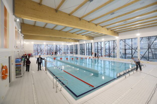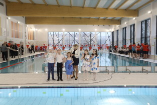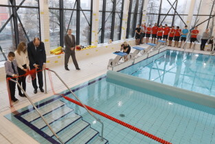 Gdańsk. Otwarcie basenu na Stogach. Przecięcia wstęgi wraz z uczniami dokonał Prezydent Gdańska Paweł Adamowicz.