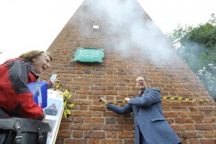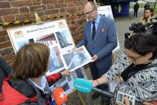 Gdańsk. Zakończyły się prace remontowe wybudowanej na przełomie XIV-XV wieku gdańskiej Baszty Jacek. Nz Maria Zakrzewska-Kierownik prac remontowych z ramienia wykonawcy. i Prezydent Gdańska Paweł Adamowicz.