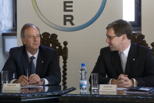 Gdańsk, Ratusz Głównego Miasta. Konferencja prasowa poświęcona planom firmy Bayer stworzenia swojego centrum finansowo-księgowego na terenie Metropolii Gdańskiej. Nz. od prawej: Prezes Bayer Sp.z o.o. Dr Dirk Ehle, Bayer Business Services GmbH Edgar Geyer