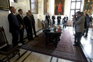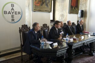 Gdańsk, Ratusz Głównego Miasta. Konferencja prasowa poświęcona planom firmy Bayer stworzenia swojego centrum finansowo-księgowego na terenie Metropolii Gdańskiej. Nz. od lewej: Bayer Business Services GmbH Edgar Geyer, Prezes Bayer Sp.z o.o. Dr Dirk Ehle, W-ce Marszałek Woj. Pomorskiego Wiesław Byczkowski, Prezydent Gdańska Paweł Adamowicz, Prezes Agencji Rozwoju Pomorza Łukasz Żelewski