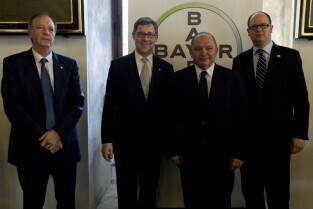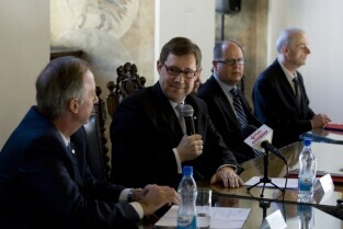 Gdańsk, Ratusz Głównego Miasta. Konferencja prasowa poświęcona planom firmy Bayer stworzenia swojego centrum finansowo-księgowego na terenie Metropolii Gdańskiej. Nz. od lewej: Bayer Business Services GmbH Edgar Geyer, Prezes Bayer Sp.z o.o. Dr Dirk Ehle, W-ce Marszałek Woj. Pomorskiego Wiesław Byczkowski, Prezydent Gdańska Paweł Adamowicz