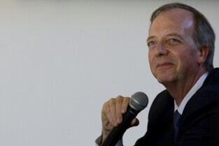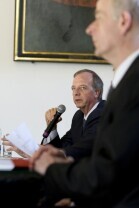 Gdańsk, Ratusz Głównego Miasta. Konferencja prasowa poświęcona planom firmy Bayer stworzenia swojego centrum finansowo-księgowego na terenie Metropolii Gdańskiej. Nz. Prezes Bayer Sp.z o.o. Dr Dirk Ehle