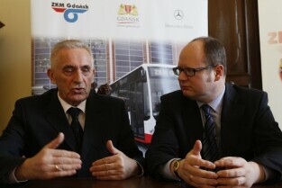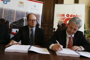 Podpisanie umowy na dostarczenie ośmiu przegubowych autobusów marki Mercedes ConectoG. Nz. od lewej: Prezes ZKM Gdańsk Jerzy Zgliczyński, Prezydent Gdańska Paweł Adamowicz