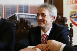 Podpisanie umowy na dostarczenie ośmiu przegubowych autobusów marki Mercedes ConectoG. Nz. Prezes ZKM Gdańsk Jerzy Zgliczyński