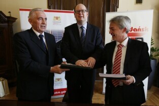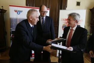 Podpisanie umowy na dostarczenie ośmiu przegubowych autobusów marki Mercedes ConectoG. Nz. od lewej: Prezes ZKM Gdańsk Jerzy Zgliczyński, Prezydent Gdańska Paweł Adamowicz, Prezes EvoBus Polska Frank Koschatzky