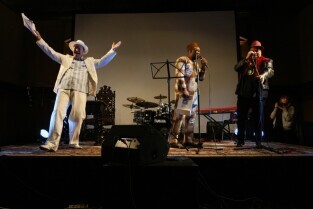 Benefis 30-lecia działalności literackiej Krzysztofa Skiby, pt. "Skiboby czyli Krzysztof Skiba XXX lat na barykadzie felietonow". Gdańsk, Nadbałtyckie Centrum Kultury. Nz. od lewej: Paweł Konio Konnak, dyrektor NCK Larry Ugwu, Krzysztof Skiba