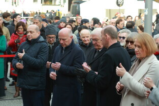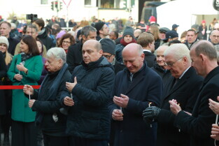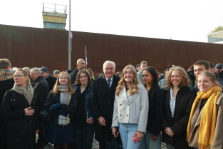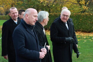 Niemcy, Berlin. 35. rocznica Upadku Muru Berlińskiego. Nz. Basil Kerski, dyrektor Europejskiego Centrum Solidarności, Burmistrz Berlina Kai Wegner, Prezydent Niemiec Frank-Walter Steinmeier, Axel Klausmeyer, dyrektor Fundacji Muru Berlińskiego.