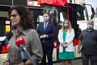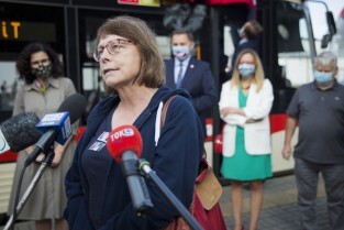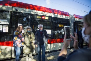 Gdańsk, Nowe Ogrody, przystanek tramwajowy. Święto Wolności i Demokracji. Bohaterki Solidarności patronkami gdańskich tramwajów – uroczystość nadania imion. Do grona patronów tramwajów dołączyły: Olga Krzyżanowska i Alina Pieńkowska. W uroczystości udział wzięli: Aleksandra Dulkiewicz, prezydent Gdańska, Piotr Borawski, zastępca prezydenta ds. przedsiębiorczości i ochrony klimatu, Agnieszka Owczarek, przewodnicząca Rady Miasta Gdańsk, Danuta Gierdziejewska zastępca prezesa GAiT oraz rodzina i bliscy noywch patronek, a wśród nich: marszałek Bogdan Borusewicz, Kinga Borusewicz, Magdalena Mierzewska oraz Bożena Krzyżanowska i Dorota Krzyżanowska.