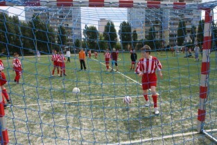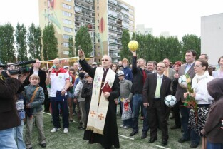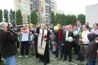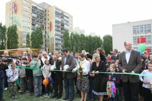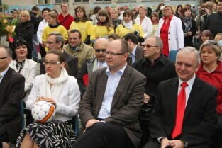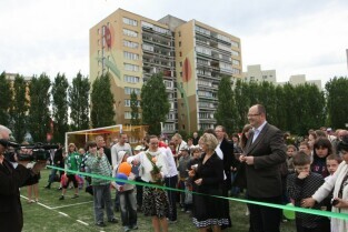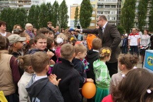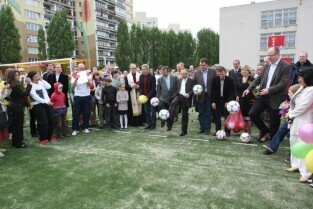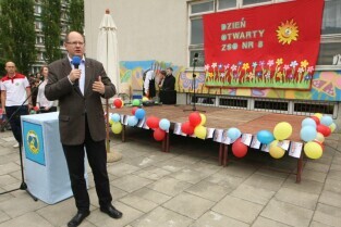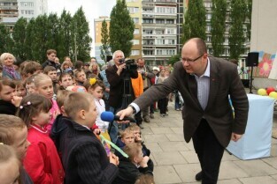 Zespół Szkół Ogólnokształcących nr 8 w Gdańsku. Oddanie do użytku zmodernizowanego boiska i dzień otwarty szkoły. Nz. Prezydent Gdańska Paweł Adamowicz