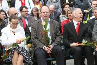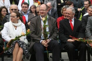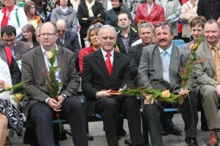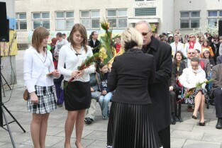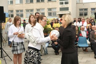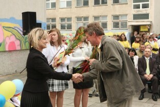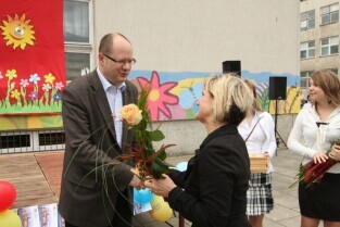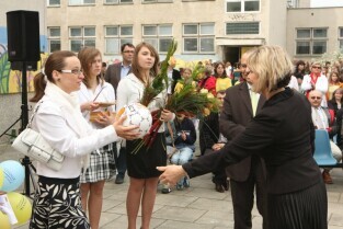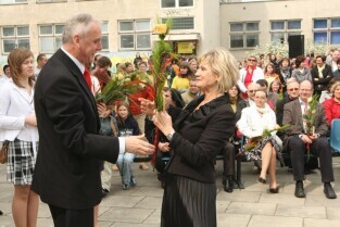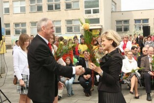 Zespół Szkół Ogólnokształcących nr 8 w Gdańsku. Oddanie do użytku zmodernizowanego boiska i dzień otwarty szkoły. Nz. Prezydent Gdańska Paweł Adamowicz i Dyrektor ZSO Danuta Kokot