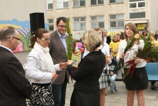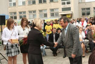 Zespół Szkół Ogólnokształcących nr 8 w Gdańsku. Oddanie do użytku zmodernizowanego boiska i dzień otwarty szkoły. Nz. z-ca dyrektora Wydziału Edukacji UMG Jerzy Jasiński i Dyrektor ZSO Danuta Kokot