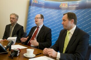 Urząd Miejski w Gdańsku. Konferencja prasowa poświęcona przekazywaniu 1% z podatku dochodowego dla organizacji pozarządowych. Nz. od prawej: Mieczysław Struk (Marszałek Województwa Pomorskiego), Paweł Adamowicz (Prezydent Gdańska) i Jerzy Boczoń (Regionalne Centrum Informacji i Wspomagania Organizacji Pozarządowych)