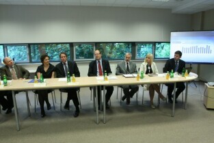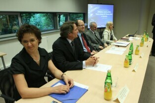 Konferencja prasowa poświęcona sytuacji na rynku pracy i działalności GE Money Bank w Gdańsku. Nz. od lewej: dr hab. Jacek Zaucha - Wydział Ekonomiczny Uniwersytetu Gdańskiego, Aleksandra Kwiatkowska - Dyrektor Biura Public Relations i Rzecznik Prasowy GE Money Bank, David Kay - Prezes Zarządu GE Money Bank, Paweł Adamowicz - Prezydent Miasta Gdańska, prof. dr hab. inż. Waldemar Kamrat - Prorektor ds. kształcenia i rozwoju Politechniki Gdańskiej, Edyta Kuczys - Dyrektor Regionu Adecco Poland, Mariusz Wiśniewski - Dyrektor ds. Marketingu InvestGDA