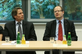 Konferencja prasowa poświęcona sytuacji na rynku pracy i działalności GE Money Bank w Gdańsku. Nz. David Kay - Prezes Zarządu GE Money Bank (po lewej) i Paweł Adamowicz - Prezydent Miasta Gdańska (po prawej)