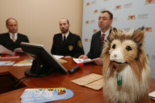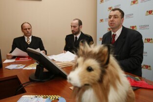 Konferencja prasowa poświęcona akcji Gminy Gdańsk i Straży Miejskiej "Pupil - czyli posprzątaj po swoim psie". Gdańsk, Urząd Miejski.