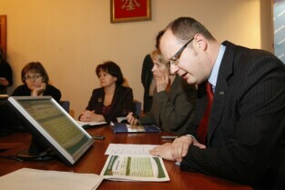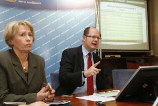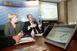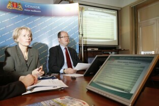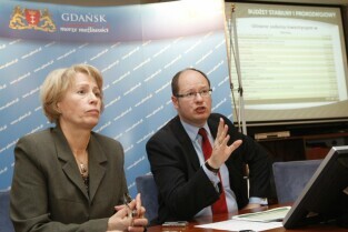 Gdańsk, Urząd Miejski. Konferencja prasowa poświęcona projektowi budżetu Miasta Gdańska na rok 2010, w której wzięli udział m.in. Prezydent Gdańska Paweł Adamowicz i Skarbnik Teresa Blacharska