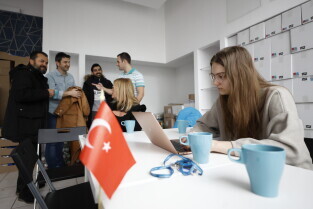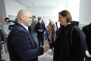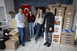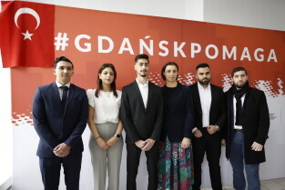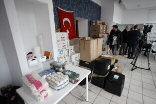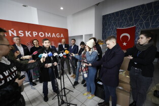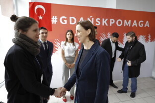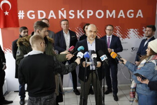 Gdańsk. Briefing prasowy w punkcie zbiórki pomocy materialnej dla ofiar trzęsienia ziemi przy ul. Grunwaldzkiej 126. W briefingu udział wzięli: Leszek Bonna, wicemarszałek województwa pomorskiego, Monika Chabior, zastępczyni prezydent Gdańska, Bartosz Bartoszewicz, wiceprezydent Gdyni, Marcin Skwierawski, wiceprezydent Sopotu oraz Hakan Haner, koordynator zbiórki."
