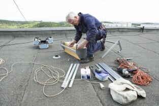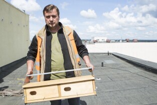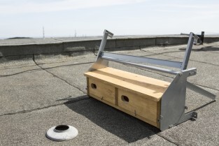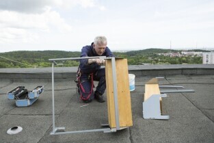 Przygotowania do zawieszenia budek lęgowych dla ptaków jerzyków. Gdańsk, Piecki Migowo, blok przy ul. Arctowskiego 6