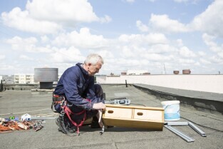 Przygotowania do zawieszenia budek lęgowych dla ptaków jerzyków. Gdańsk, Piecki Migowo, blok przy ul. Arctowskiego 6. Nz. Mirosław Urbanowicz - himalaista, który będzie wieszać budki