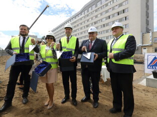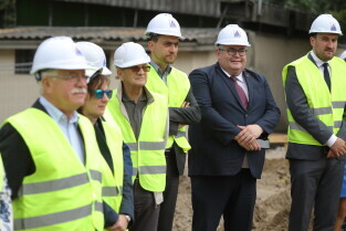 Gdańsk, Szpital św. Wojciecha. Uroczystość wmurowania kamienia węgielnego pod budowę bloku operacyjnego. Nz. Wicemarszałek Województwa Pomorskiego Paweł Orłowski, Posłanka-Hanna Zych-Cisoń, Marszałek Województwa Pomorskiego Mieczysław Struk, Wiceprezydent Gdańska Piotr Kowalczuk i Dariusz Kostrzewa-Prezes Zarządu COPERNICUS Podmiot Leczniczy Sp. z o.o.