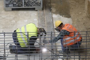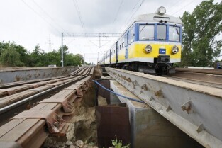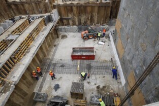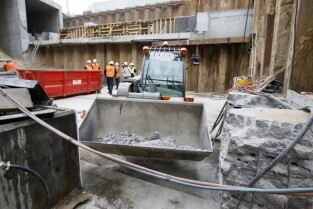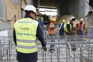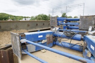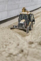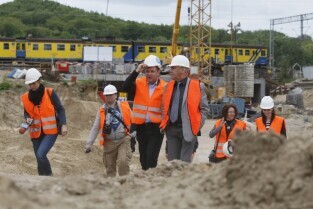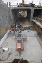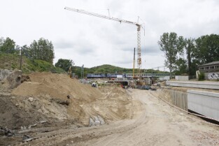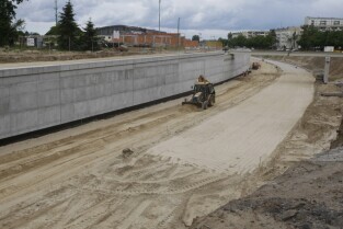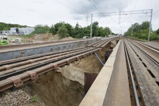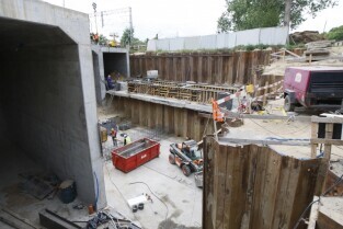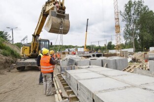 Budowa Drogi Zielonej przebiegającej na granicy Gdańska i Sopotu, od Ergo Areny do skrzyżowania al. Grunwaldzkiej, Niepodległości i ul. Czyżewskiego. Nz. "wiszące w powietrzu" tory kolejowe, pod którym "przepychana" jest żelbetonowa kontrukcja tunelu