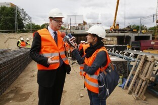 Budowa Drogi Zielonej przebiegającej na granicy Gdańska i Sopotu, od Ergo Areny do skrzyżowania al. Grunwaldzkiej, Niepodległości i ul. Czyżewskiego. Nz. Prezydent Gdańska Paweł Adamowicz udziela wywiadu dziennikarce Radia Gdańsk