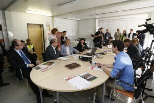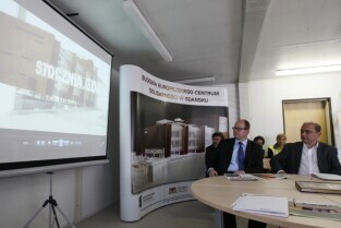 Prezydent Gdańska Paweł Adamowicz, Dyrektor ECS Basil Kerski i Wiceprezes GIK Romuald Nietupski w towarzystwie dziennikarzy zwiedzili budowę gmachu Europejskiego Centrum Solidarności w Gdańsku. Nz. konferencja prasowa poprzedzająca zwiedzanie
