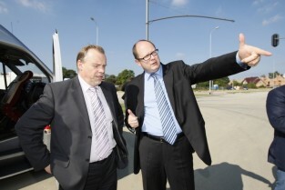Budowa ulicy Nowej Łódzkej, która połączy dzielnice południowe Gdańska z Trasą W-Z. W ramach inwestycji powstaje także przedłużenie linii tramwajowej z Chełmu do ul. Świętokrzystkiej. Nz. od lewej: Dyrektor Naczelny Dyrekcji Rozbudowy Miasta Gdańska Włodzimierz Bartosiewicz, Prezydent Gdańska Paweł Adamowicz